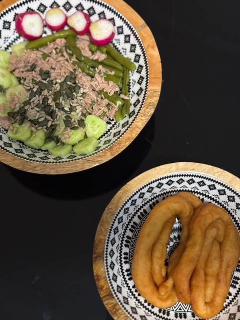 Die Bohnen einige Minuten lang kochen. Sobald sie al dente sind, abgießen und sofort in eine große Salatschüssel geben. Die in Scheiben geschnittene Gurke, den Thunfisch und einige ebenfalls in Scheiben geschnittene Radieschen hinzufügen. Grobes Salz, Olivenöl und Zitronensaft dazugeben und gut vermischen. Zum Schluss mit Kürbis- und Sonnenblumenkernen bestreuen. Als Hauptgericht oder Beilage servieren. Am besten schmeckt der Salat zu Lalangia von der Halbinsel Mani!