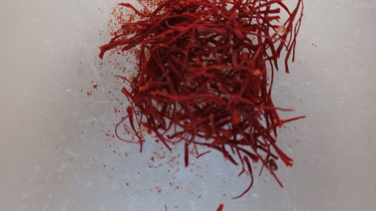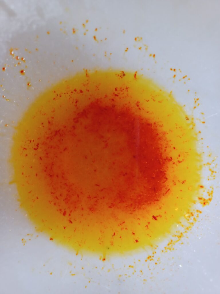 Image 2. Kozani saffron stamens, ground and dissolved in warm water. This is how the aroma and colour of saffron are incorporated into recipes. Photograph by S.M. Valamoti