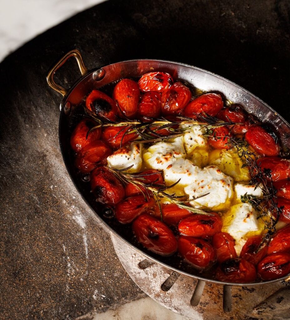 Τοποθετούμε τα τοματίνια σε ένα πυρίμαχο σκεύος και στη μέση τοποθετούμε το τυρί. Προσθέτουμε και τις 2 σκελίδες σκόρδο. Περιχύνουμε με ελαιόλαδο και δεντρολίβανο και ψήνουμε για 30 λεπτά.