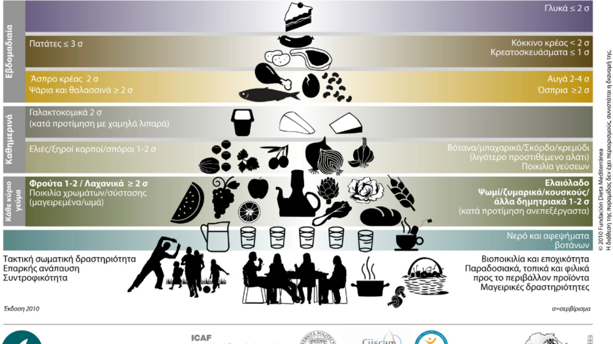 Η πυραμίδα αυτή αντικατοπτρίζει τις παραδοσιακές διατροφικές συνήθειες των χωρών της Μεσογείου, συμπεριλαμβανομένης της Ελλάδας.