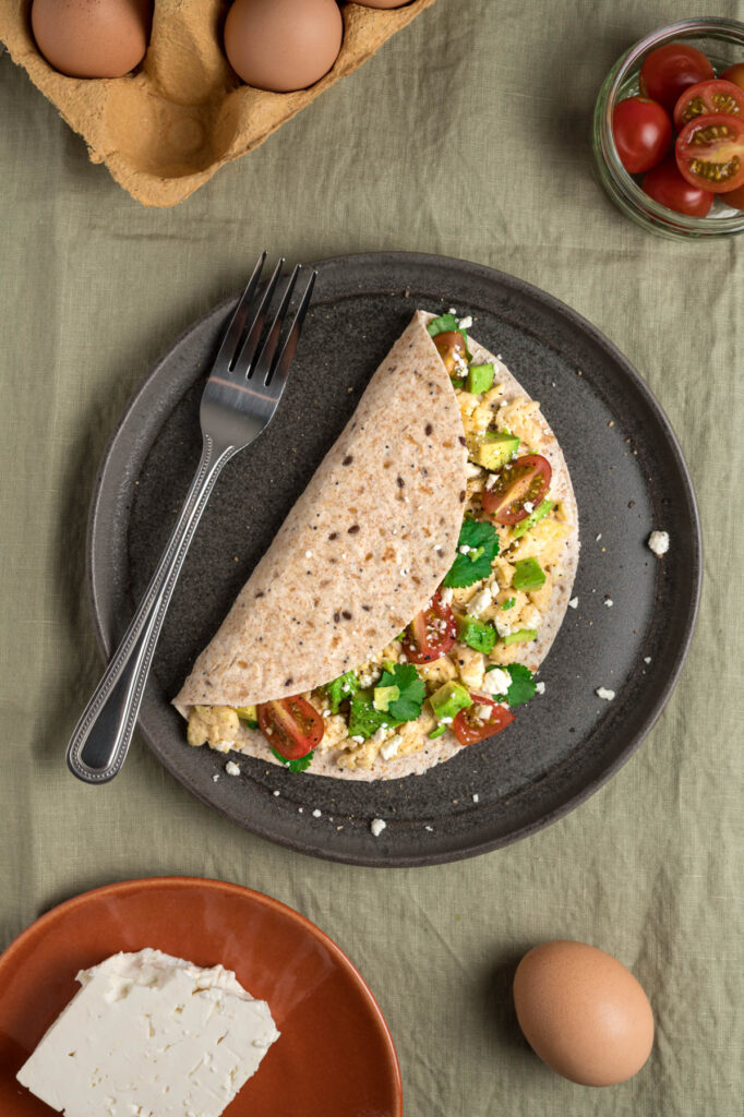 Στη μισή επιφάνειά της σκορπίζουμε λίγη θρυμματισμένη φέτα. Ψιλοκόβουμε το αβοκάντο κα το ρίχνουμε από πάνω. Προσθέτουμε τα αυγά, τα ντοματίνια και ξαναρίχνουμε φέτα. Τελειώνουμε με μαϊντανό.
