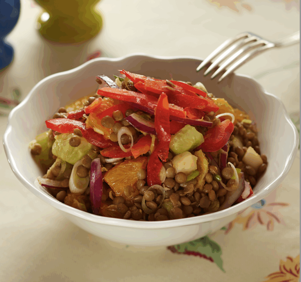 Ξεπλύνετε καλά τις φακές και βράστε τες σε αλατισμένο νερό για περίπου 50 λεπτά, ή έως ότου βράσουν. Σουρώστε τις φακές και αφήστε τες να κρυώσουν. Στο μεταξύ βάλτε όλα τα υπόλοιπα υλικά σε ένα μπολ σαλάτας και ανακατέψτε καλά. Προσθέστε τις κρύες φακές και αφήστε το μείγμα για 10 λεπτά ώστε να ενωθούν οι γεύσεις. Σερβίρετε ή στο μπολ ή σε μικρά ατομικά πιατάκια.