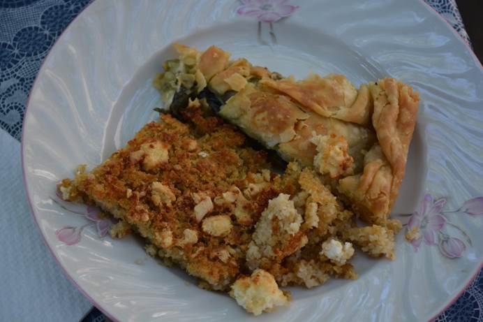 Trahanas paj (vänster) och spenat- och ostpaj med filodeg, bakad av Sophia Papageorgiou (†) i Kosmati, Grevena, september 2017. Fotografi av S.M. Valamoti,