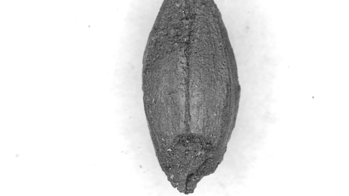 Resim 1: Makedonya Dion’dan kömürleşmiş arpa tanesi, M.s. 4. yüzyıl (fotoğraf S.M.Valamoti, Valamoti, Fyntikoglou, Symponis 2022).